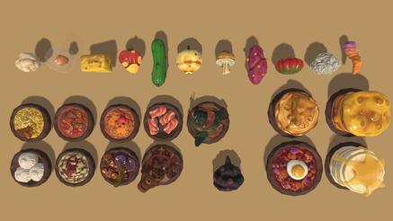 I was the sole artist on this project responsible for kitchen space, furniture, all of the food items, and the Orc characters.